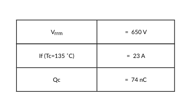 Features • Temperature independent fast switching • Low reverse leakage current • Low Vf at high temperatures • Easy paralleling (positive temperature coefficient of Vf ) • High repetitive surge current Benefits • Replace bipolar with unipolar rectifiers • Essentially no switching losses • Higher efficiency • Reduction of heat sink requirements • Parallel devices without thermal runaway Applications • Switch mode power supplies (SMPS) • Power factor correction • Motor drives • Electric vehicles and battery chargers • Solar inverters • Free wheeling diode